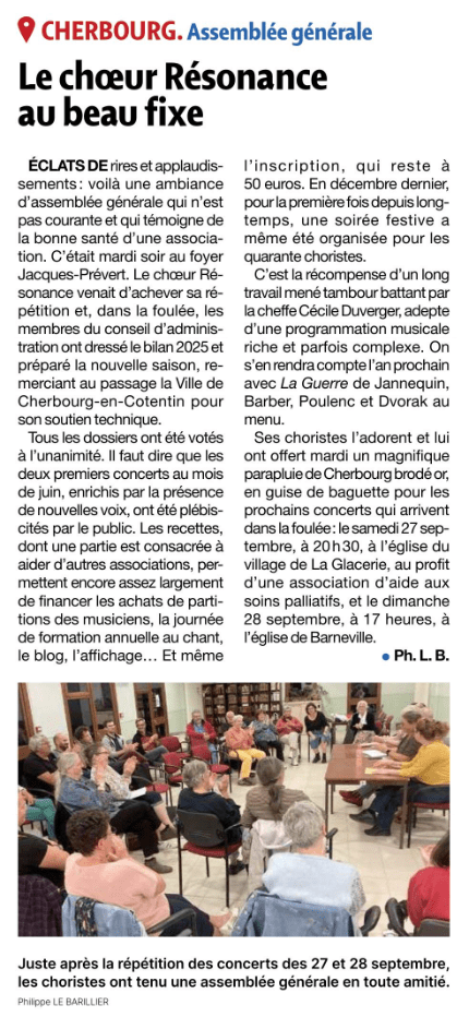 Eclats de rires et applaudissements: voilà une ambiance d’assemblée générale qui n’est pas courante, et qui témoigne de la bonne santé d’une association. C’était mardi soir 9 septembre au foyer Jacques-Prévert à Octeville. Le choeur Résonance venait d’achever sa répétition et dans la foulée, les membres du conseil d’administration ont dressé le bilan 2025 et préparé la nouvelle saison, remerciant au passage la ville de Cherbourg-Octeville pour son soutien technique.