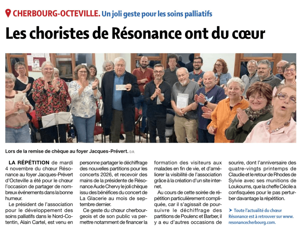 L’association pour le développement des soins palliatifs du Nord-Cotentin se dit très sensible à la proposition du chœur Résonance de Cherbourg de chanter samedi soir 27 septembre 2025 au profit de ses activités.