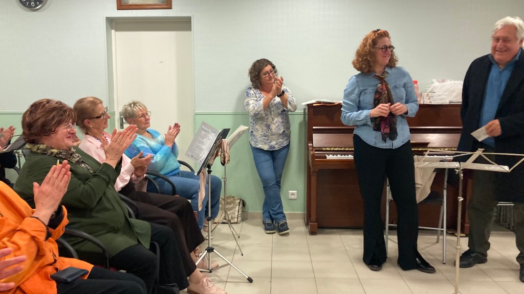 Au cours de cette soirée de répétition particulièrement compliquée car il s’agissait de poursuivre le déchiffrage des partitions de Poulenc et Barber, il y a eu d’autres occasions de sourire, dont l’anniversaire des quatre-vingt printemps de Claudie et le retour de Rhodes de Sylvie avec ses munitions de Loukoums, que la cheffe Cécile a confisquées pour ne pas perturber davantage la répétition.