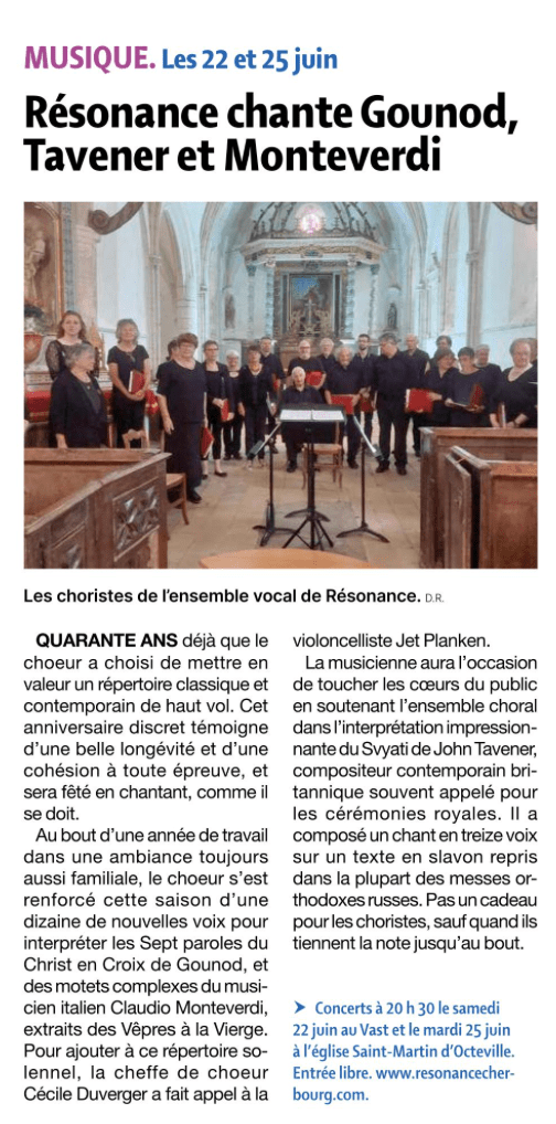 Un mini concert inattendu du choeur Résonance est programmé le samedi 24 février à 18 heures au Point-du-Jour, centre régional de la photo, près du jardin public à Cherbourg. La dernière répétition aura lieu mardi prochain 20 février.