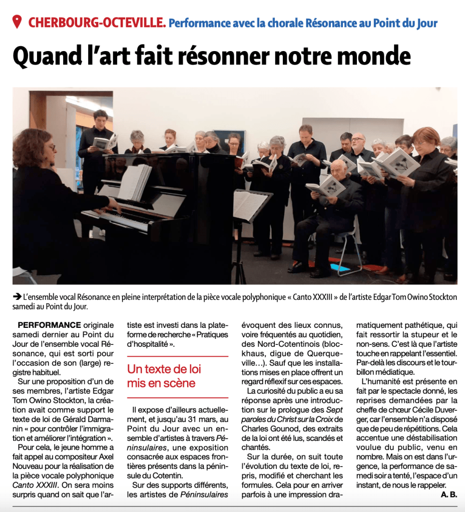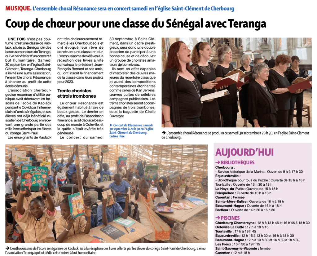 La présidente avait, en début de concert, tenu à remercier Résonance pour son geste. Et le maire du Vast, qui a accueilli le groupe avec une extrême gentillesse…et de belles brioches, a souhaité que le choeur revienne une troisième fois dans sa commune.